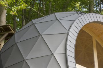 Das kugelförmige Baumhaus „Echo“ im Baumhaushotel K1 wurde als geodätische Kuppel konzipiert und befindet sich mitten im Wald. Für die Außenhülle kam ausschließlich VMZINC QUARTZ-ZINC zum Einsatz – ein vorbewittertes Zinkmaterial, das sich besonders gut für die spezielle Form eignete. Rund 200 m² dieses Materials wurden in Form von großformatigen Schindeln verarbeitet, die größtenteils gleichseitige Dreiecke bilden. Aufgrund der geometrischen Anforderungen waren 13 unterschiedliche Schindelformen nötig.