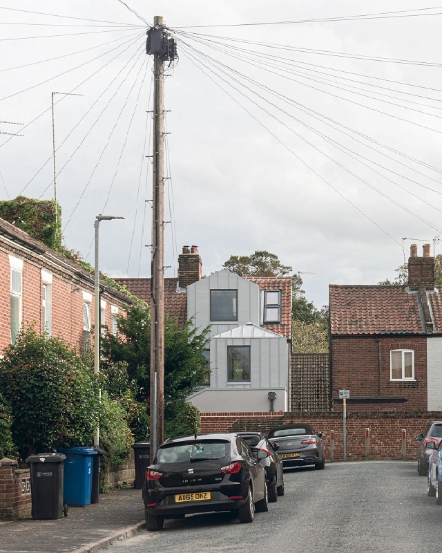 High levels of insulation and carefully placed windows promote cross-ventilation. Two interlocking zinc-clad boxes were installed above the rear extension. VMZINC is fully recyclable and does not require any protection. It also helps to reflect heat improving cooling in summer. Zinc has a corrosion rate of 1(1) μm/year offering a lifespan of over 100 years.