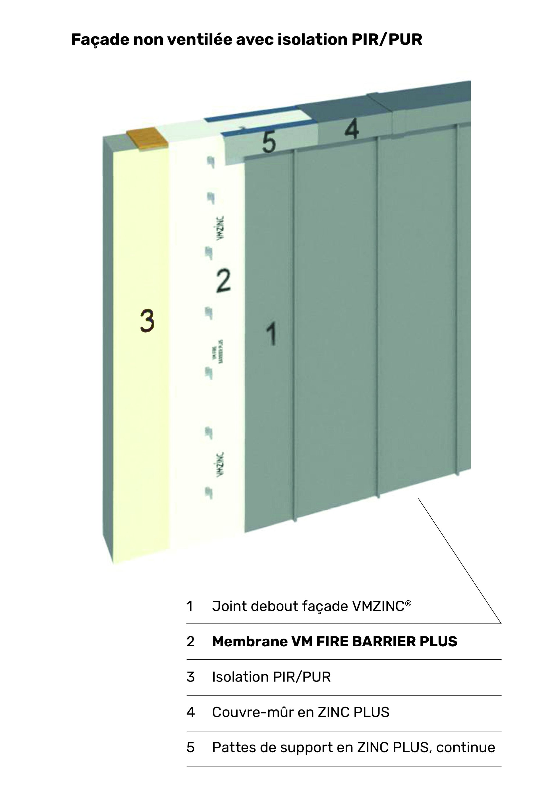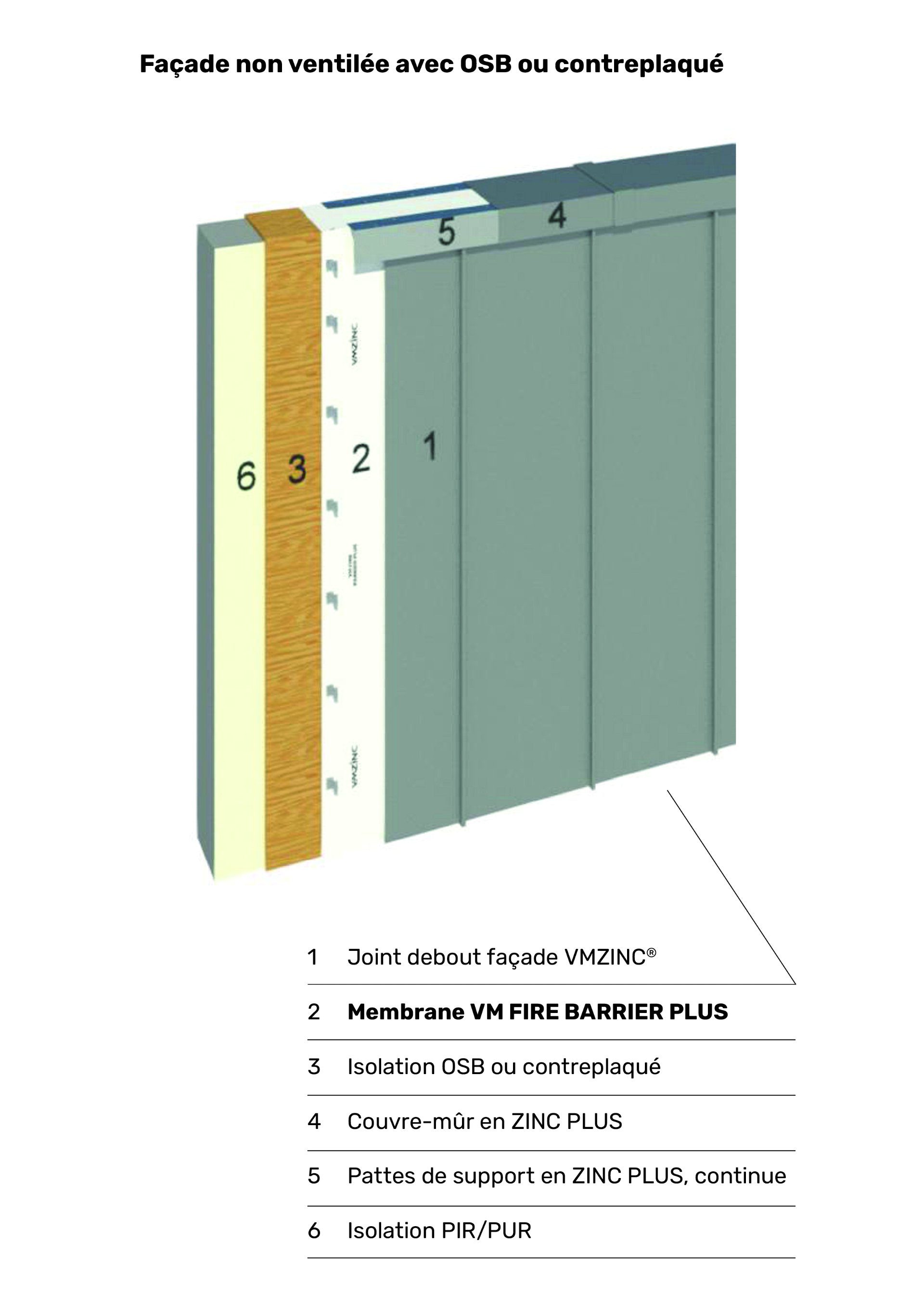 C’est pourquoi VM Building Solutions lance VM FIRE BARRIER PLUS – une membrane coupe-feu innovante, spécialement développée pour les façades chaudes non ventilées avec ZINC PLUS de VMZINC.
