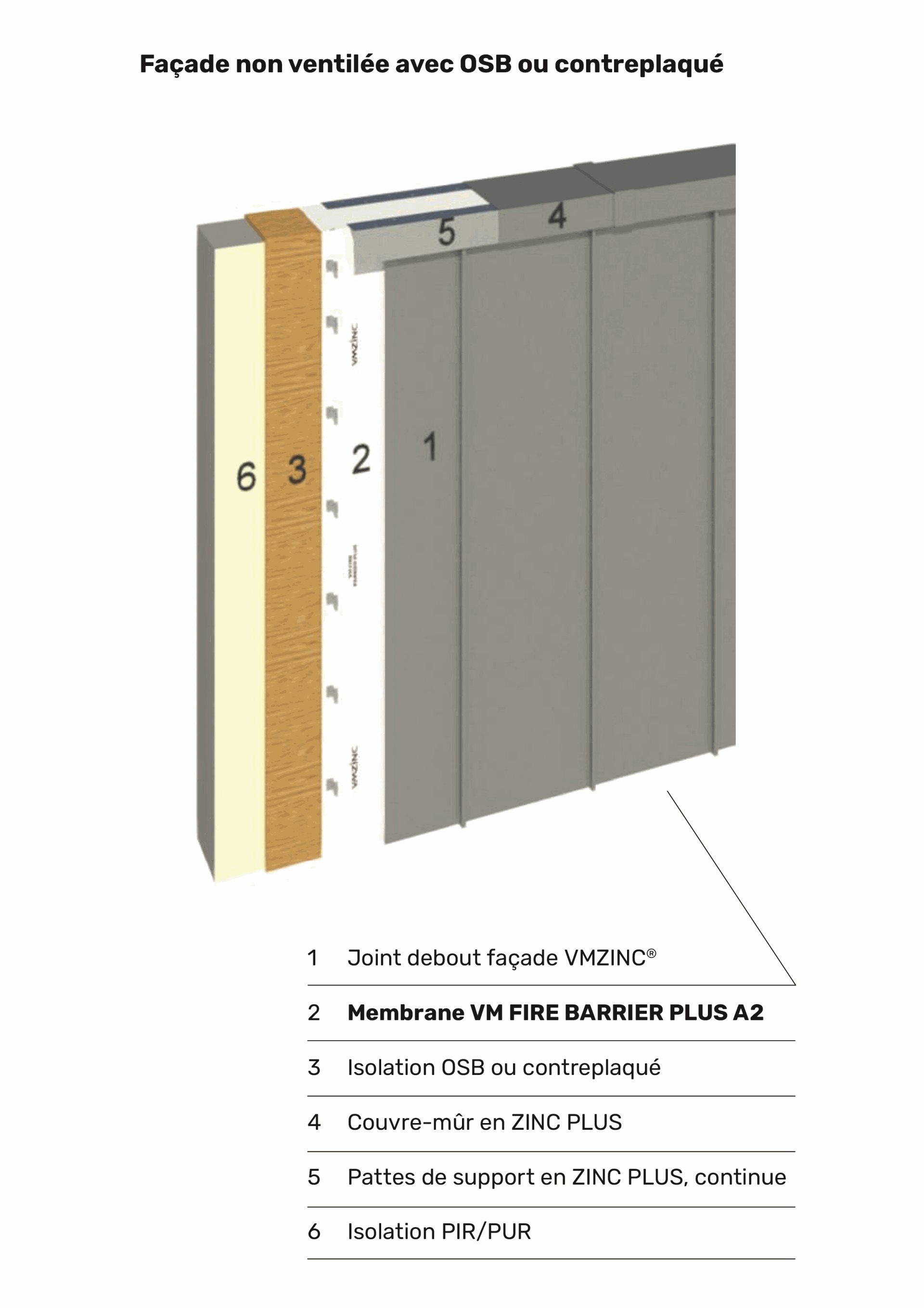 C’est pourquoi VM Building Solutions lance VM FIRE BARRIER PLUS A2 – une membrane coupe-feu innovante, spécialement développée pour les façades chaudes non ventilées avec ZINC PLUS de VMZINC.