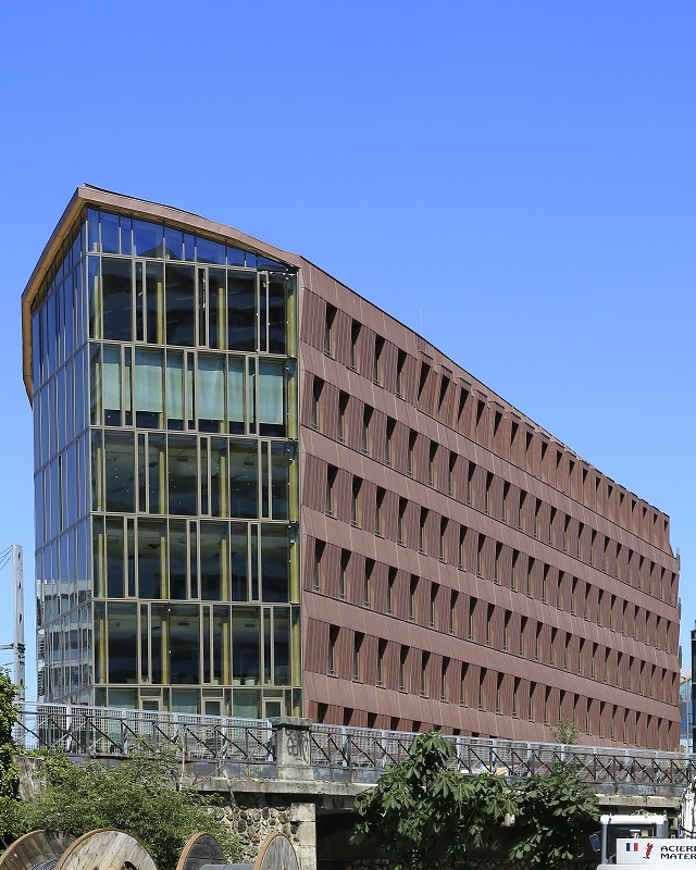 Le bâtiment conçu par Anne Carcelen est le 13e et dernier immeuble construit sur ce site de 10 ha. L’architecte a tenu compte de l’évolution du lieu et des transformations du quartier. Le réaménagement, de l’autre côté des voies ferrées, des anciens entrepôts Macdonald, a placé l’extrémité de la parcelle dans une position urbaine centrale, le long d’une allée piétonne stratégique. Le projet devait dès lors assumer un rôle de signal que son emplacement périphérique dans le parc d’activité tertiaire ne laissait pas présager. Depuis la rue, il apparaît comme un vaisseau imposant et majestueux traçant son sillon dans le flot es infrastructures ferroviaires et fluviales.