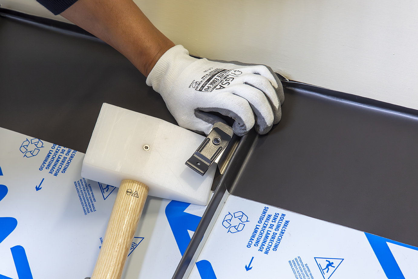 Tracer les repères puis insérer et régler les clips dans le joint debout sans les écraser. Sertir à nouveau.