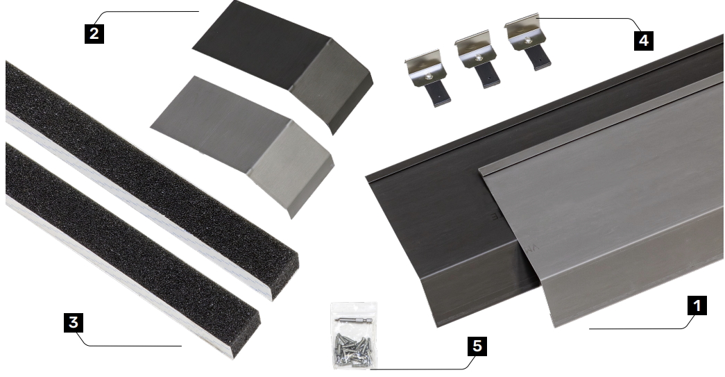5 raccords | 5 éclisses | 6 bandes | 25 clips | 25 vis + 1 embout |